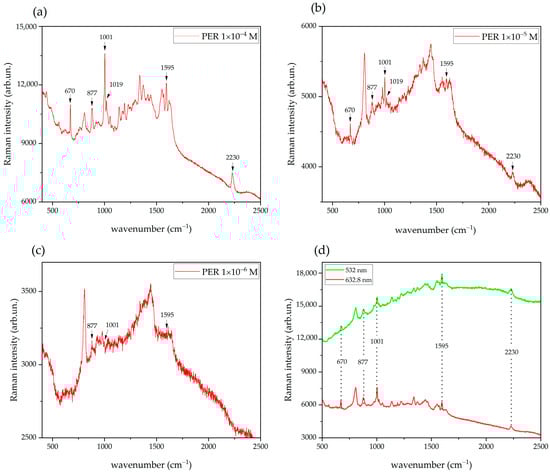 All the expected SERS markers of PER (670, 877, 1001, 1019, 1595, 2230 cm−1) are well-resolved, intense, and clearly distinguishable from the spectral features of the background, which can be easily inferred from the SERS spectrum of PER measured at the lowest concentration (1 × 10−6 M, Figure 6c). In the spectrum of the solution at highest concentration (1 × 10−4 M) we can spot additional weak peaks at 1225 and 1447 cm−1 (in-plane C-H bending coupled with ring deformation [6]). The SERS spectrum of the 1 × 10−6 M solution (Figure 6c) shows some weak peaks that can be identified around 877, 1001, and 1595 cm−1, but the signal-to-noise ratio is too low to reliably quantify PER.