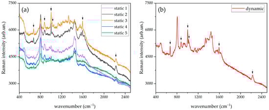 (a) SERS spectra of PER 1 × 10−4 M recorded in static mode in different spots or (b) with the spinning-cell setup (dynamic mode). 632.8 nm excitation laser, 5 mW incident power, 10 s exposure time (5 averages), 20× objective. All the spectra are reported with no background subtraction and no normalization. The main PER peaks are highlighted by arrows.