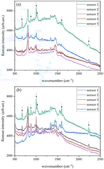 We report in Figure 8a,b two selected sets of SERS spectra obtained from PER 5 × 10−5 M solutions that were recorded, respectively, on paper-based SERS sensors produced by natural sedimentation and by centrifugation (see Section 2.2). Six PER markers (670, 877, 1001, 1019, 1595, and 2230 cm−1) are clearly visible in both cases. Similar results are obtained for PER 1 × 10−4 M and 1 × 10−5 M. The intense peak around 807 cm−1, which is not affected by PER concentration, is assigned to the background, together with the structured feature between 1300 and 1500 cm−1.