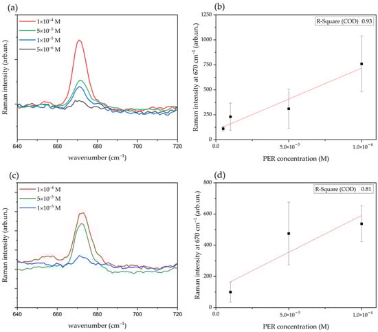Baseline-corrected average SERS spectra of the 670 cm−1 marker of PER measured at different concentrations with sensors produced by natural sedimentation (a), or by centrifugation (c). For each specified concentration, the average spectrum is obtained from five spectra using the corresponding Omnic™ tool [48]. The panels (b,d) show the calibration curves corresponding to the SERS data (a,c), respectively; the vertical error bars represent the standard deviations.