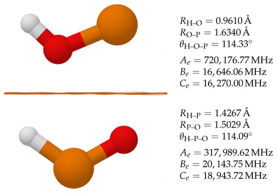 The electronic arrangement strongly affects the geometry of the molecule, and these changes are worth noticing, especially in small molecules, such as POH and HPO. Table 1 reports the molecular structure of POH and HPO in the electronic ground state and in the first excited state at the ae-CCSD(T)/cc-pwCVQZ level of theory. The inspection of Table 1 demonstrates that HPO has a P–O bond distance of 1.4799 Å, while the P–H bond length is 1.4521 Å. The excitation of one electron that leads to the triplet state strongly affects the molecular stability, with the P–O bond becoming longer by about 20 mÅ. At the same time, the P–H bond becomes shorter by about 30 mÅ. The angle varies from 104.5 in the singlet state to 114.9 in the first excited, triplet state. The remarkable changes noticed for HPO are mitigated in the POH system. In this case, the ground triplet state is characterised by a H–O bond distance of 0.9605 Å, and that of P–O is 1.6346 Å. The former bond length remains nearly unchanged in the singlet state, i.e., 0.9626 Å, while the P–O distance becomes shorter by 20 mÅ, similarly to what occurs in the HPO molecule. For comparison purposes, HPO and POH have been further investigated at the CC level of theory and the corresponding geometries are reported in Figure 1. This higher level of theory corroborates the ae-CCSD(T)/cc-pwCVQZ results, with changes varying well within 2 mÅ for bond distances and 0.5 for angles. The equilibrium rotational constants obtained from the CC composite scheme are reported in Figure 1, and their accuracy will be discussed in Section 4 (Discussion).