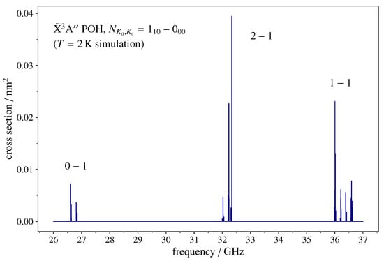 Spectral simulation of the transition of POH in the microwave band, as can be observed using a broadband spectrometer. The fine-structure is a triplet of lines spread over ~10 GHz. Each component is split in a number of closely spaced features by the hyperfine couplings. The y-axis scale indicates the absorption cross-section computed at 2 K, the typical rotational temperature obtained in a supersonic-jet cooled sample. See text for computational details.