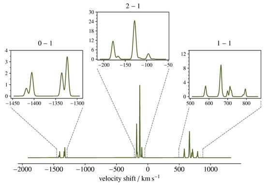The two non-zero components of the molecular electric dipole moment (see Table 2) generate a-type () and b-type () spectra. Each transition typically consists of three widely separated fine-structure lines, each split in many closely spaced hyperfine components. An example of such a pattern is depicted in Figure 2, which shows the rotational transition as it would be recorded by a broadband spectrometer operating in the microwave band. The rotational parameters employed for the simulations are reported in Table 2 and Table 3.