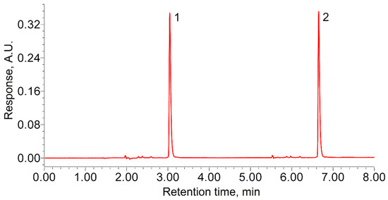 The TODGA retention time in the selected analysis conditions was 1.13 ± 0.02 min. The calibration tests showed high reproducibility of the results obtained in the considered experimental unit. In all the tests, the sample from the autoclave was injected at least twice (Figure 1), to exclude accidental error. Since the TODGA concentration in the autoclave decreased after the sample collection, the area of the next peak was always 0.3–0.5% smaller than that of the previous one. Taking this into account, we were able to estimate the approximate rate of TODGA sample dissolution in the experimental conditions. It was established that increasing the dissolution time from 10 to 60 min did not increase the chromatographic response. This indicates that the TODGA samples completely dissolved in less than 10 min.