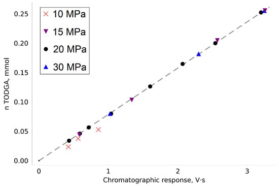 Most of the calibration points were obtained at a pressure of 20 MPa. However, to confirm its performance in the extended CO2 density range, we obtained several points in the pressure range from 10 to 30 MPa. When the pressure in the system was reduced to 10 MPa, there were nonreproducible errors in the analyzed points, which are characteristic of conditions of incomplete substance dissolution. This effect was observed even with relatively small concentrations of TODGA. For this reason, the points obtained at 10 MPa were not used to construct calibration dependence.