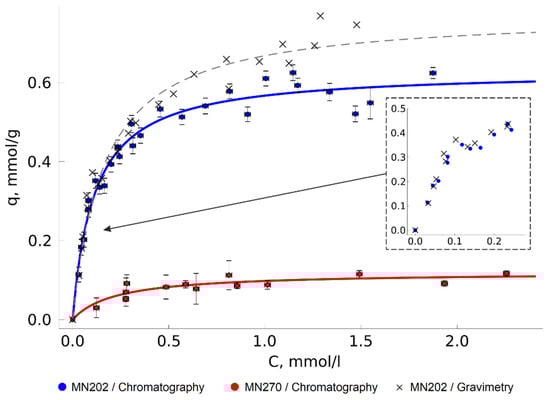 Overall comparison of Langmuir model parameters of TODGA adsorption isotherms is given in Table 1. In the considered conditions, the saturation of the TODGA monolayer on the MN202 surface was reached at approximately 0.64 mmol/g; the mass equivalent of this value, 0.37 g/g, is close to the values of the analogous commercially available sorbents’ load []. Interestingly, the maximum adsorption on MN270 is much lower, at 0.10 mmol/g. Since the nature of the sorbent surface is identical, this is most probably caused by the difference in the pore size and accessibility. The sorbents’ declared characteristics [,] show that the only significant difference of MN270 from MN202 is the higher degree of crosslinking, which reduces the mesopores’ average size from 220 Å to 80 Å and increases the specific surface area. The specific surface area of the sorbents in a non-swollen state measured by low temperature nitrogen adsorption was 590 ± 40 m3/g and 980 ± 50 m3/g for MN202 and MN270, respectively.