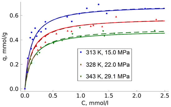 The methods of adsorption measurement of SC fluid solution components are largely analogous to those used to measure adsorption from liquid solutions. The methods can be divided into dynamic and static. The dynamic adsorption measurement methods are based on analyzing the substance penetration through an adsorbent layer in a column. There are examples of successful applications of dynamic methods (column breakthrough [,,] and chromatographic [,,,,,,] methods) to measure adsorption in SC fluid media. However, the accuracy of the dynamic methods is largely dependent on the column packing with an adsorbent due to the hydrodynamic effects []. This means that these methods are not reliable in case of HCP studied in our work as we have earlier determined in our laboratory that the use of such materials in SCF leads to changes in the particle size caused by swelling and destruction of the column packing layer [].