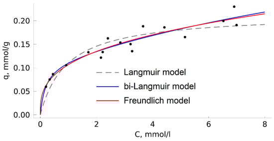 The Langmuir model is among the simplest ones. It describes in theoretical terms the ideal homogeneous adsorption of gases (adsorption on the surface with a regular arrangement of adsorption centers, identical in energy, with no adsorbate-adsorbate interactions). It is often suitable for describing adsorption from liquid solutions but, in such cases, it should be considered as a semi-empirical model because it contradicts the model postulate about the absence of interaction between the adsorbate particles and between the adsorbate and solvent particles, which leads to misinterpretations of the thermodynamic meaning of the adsorption equilibrium constant []. There are numerous empirical and semi-empirical models that take into account adsorption heterogeneity and other factors to describe complex isotherms. In the considered case of TODGA adsorption from a solution in methanol, the bi-Langmuir and Freundlich models demonstrated reasonably good approximations. The parameters of the model equations are given in Table 3.