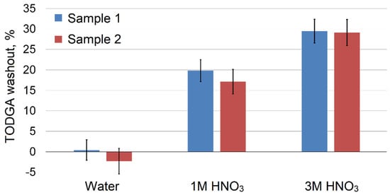 Since TODGA is used for metal adsorption from acidic solutions, in this work we compared the resistance of impregnated adsorbents to being washed out by nitric acid. We prepared samples through equilibrium adsorption from SC CO2 (sample 1) or evaporation from methanol solution (sample 2) with the TODGA content of 0.28 g/g and 0.31 g/g, respectively, according to the method described in the experimental section. After washing out the adsorbents with water and nitric acid solutions, we calculated the decrease in TODGA concentration in the adsorbent samples (Figure 7). The water did not have a leaching effect on impregnated adsorbents; however, as it was expected, in acidic solutions the formation of TODGA complexes with nitric acid [] led to the extraction of the chelating agent into the solution. The leakage of TODGA and other ligands is a common feature of such sorbents reported in many works [,,]. Despite this fact, they can be successfully applied in various separation processes in practice.