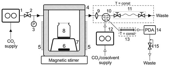 Scheme of the experimental unit: 1—CO2 pump, 2—valve, 3—pressure transducer, 4—autoclave, 5—heating jacket, 6—magnetic stir bar, 7—support, 8—glass vial with an adsorbent, 9—in-line filter, 10—6-port valve with a sample loop, 11—sampling device, 12—chromatograph pump, 13—chromatographic column, 14—detector, 15—automatic back pressure regulator.