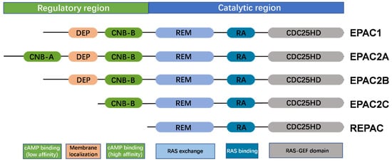 EPACs have similar protein structure as other cAMP-activated guanine nucleotide exchange factors (cAMP-GEFs) including N-terminal cAMP-binding domains and a C-terminal GEF domain. Phylogenetic analysis has shown that the N-terminal of EPAC—an autoinhibitory regulation domain probably evolved from the R subunit of PKA—is highly homologous to the Ras-GEF proteins [21]. According to the sequences and domain structure, three different isoforms of EPAC protein family were identified and defined as EPAC1, EPAC2 and REPAC (for related to EPAC). They consist of N-terminal autoinhibitory region (a dishevelled Egl-10, pleckstrin homology domain, and cyclic nucleotide binding domains) and C-terminal catalytic region (a RAS exchange motif, a RAS-association domain, and a CDC25 homology domain) (Figure 1) [22,23,24].