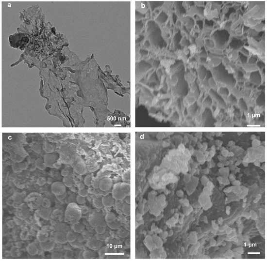 The scanning electron microscope (SEM) and transmission electron microscope (TEM) images of GWS180M800 are shown in Figure 1a,b. Figure 1c,d show the SEM results of the catalysts GWS180M and GWS800, respectively. It can be seen from the SEM image that the melamine and the walnut green peel will be hydrothermally combined, and the combination will collapse to form a honeycomb porous structure during the high-temperature carbonization process. The SEM images of GWS800 and WS180M800 show a block structure, so melamine has an important influence on the formation of the porous structure of the catalyst. In addition, the TEM image further shows that the prepared WS180M800 becomes thinner, which is consistent with the result of the SEM honeycomb structure.
