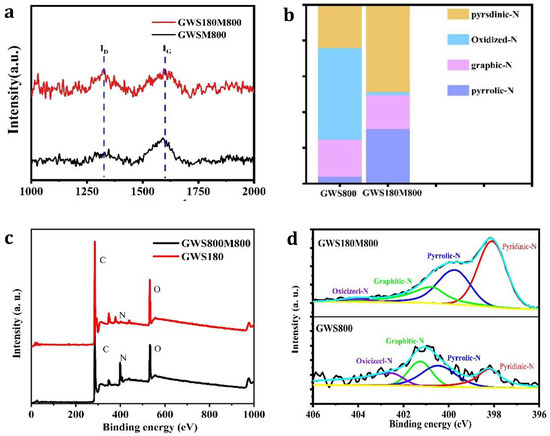 Raman spectra (a) of catalysts XPS spectrum (b), high-resolution XPS spectrum of N 1s (c), 3D bar graphs of the relative content of nitrogen species on the surface of GWS180M800 (d).
