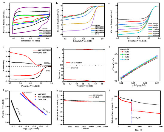 CV curves (a) of all catalysts in O2 saturated 0.1 M KOH solution at room temperature and scanning rate of 50 mV/s. The LSV curves of GWS-X at an electrode rotation rate of 1600 rpm and a scan rate of 10 mV/s (b). The LSV curve (c) of GWS180M800 at different speeds from 400 to 2025 rpm corresponds to the K-L diagram (f) GWS180M800 from 0.2 to 0.6 V respectively. The RRDE linear scan voltammogram of GWS180M800 and 20 wt% Pt/C in 0.1 M KOH saturated with O2, the electrode rotation rate and scan rate are 1600 rpm and 5 mV/s, respectively (d). Electron transfer number n (up e) and H2O2 yield (down e) calculated from the results of GWS180M800 and 20 wt% Pt/C RRDE measurement. Tafel slope curve spectrum (g). The stability curve of GWS180M800 and 20 wt% Pt/C in O2-saturated 0.1 M KOH solution, RDE rotation rate of 1600 rpm 15,000 s stability curve (h) and methanol measured by chronoamperometric amperometric method Tolerance performance curve (i).