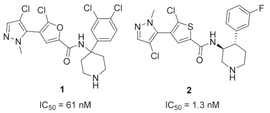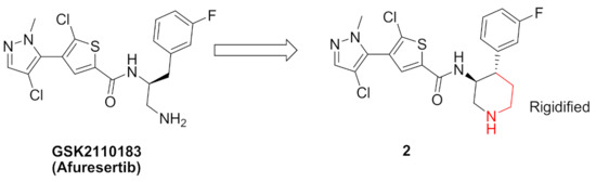 Compound 2 (Figure 2) was designed as a rigid analogue of GSK2110183 (afuresertib) (Figure 5). Afuresertib is a pyrazole-based Akt1 kinase inhibitor whose Ki value is 0.08 nM. It possesses a flexible part in its structure, which was constrained in compound 2. Its IC50 value against Akt1 is 1.3 nM. In addition, it showed antiproliferative activity against HCT116 colon cancer cell line (IC50 = 0.95 µM, 1.84-fold more potent than uprosertib). Compound 2 induced apoptosis in HCT116 cells and arrested their cell cycle at S phase. More interestingly, compound 2 demonstrated much higher potency over leukemia cell lines. For example, its IC50 values against MM1S, CEM-C1, and CCRF-CEM cell lines are 0.002, 0.007, and 0.008 µM, respectively. In the MM1S xenograft model, compound 2 could reduce tumor growth by 42%. Upon oral administration of 10 mg/kg of compound 2 in rats, its oral bioavailability is 52.5%. Moreover, compound 2 had a moderate inhibitory effect on hERG (40% inhibition when tested at 3 µM concentration). The SAR shows that the two chloro and one fluoro atoms in the structure of compound 2 are the best for activity. Replacement of any of them with any other group weakened the potency [11].