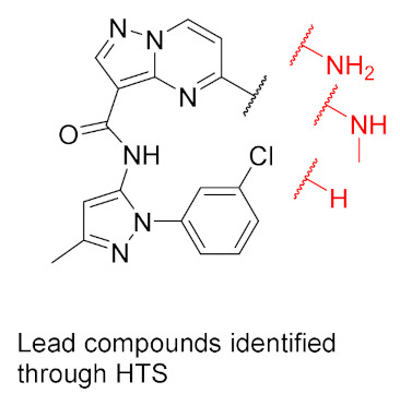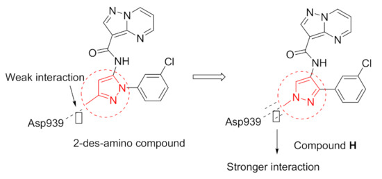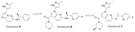 Inspired by the lack of brain-penetrant ALK inhibitor for elucidation of ALK’s role and mechanism in brain functions, Fushimi et al., developed compound 3 (Figure 7) [12]. The development stage started with lead discovery through high-throughput screening to find a potent brain-penetrant ALK inhibitor. The lead possesses imidazo[1,2-b]pyridazine scaffolded and with further SAR, compound A (Figure 8 and Figure 9), which had a potency comparable to crizotinib but lacked selectivity (potent TrkA inhibition and moderate kinase activity), was developed. To achieve selectivity to ALK over TrkA, a cocrystal structure of compound in ALK’s active site was generated. The cocrystal structure indicated an interaction between pyrazole and Glu1197 and Met1199 in the hinge region, the N at position 5 forcing the pyrazole to adopt a conformation optimal for interaction due to a steric clash with hydrogen at position 4 of pyrazole. The interaction between Leu1256 and imidazole ring, the pyridazine ring, and the 2,4-difluorophenyl group stabilized the L shaped confirmation (Figure 9).