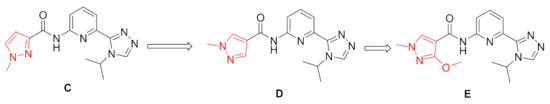 Potency was improved by replacing the hydrophobic phenyl ring with a more polar heterocycle such as the five-membered pyrazole. The first analogue, C (Figure 13) showed a 20-fold increase in potency compared to the lead compound (IC50 = 29 nM) on ASK1. Further investigations led to D (Figure 13), the positional isomer of C. Compound D was superior to C cell’s assay cell (D’s IC50 = 6.8 μM vs. C’s, cell IC50 > 20 μM). To mask the NH of amide, substituents were introduced on the pyrazole ring. The modification introduced in C induces an important conformational distortion. Introduction of methoxy had a dramatic effect on the potency. Compound E (Figure 13) had an IC50 of 90 nM on cell assay but had a low in vivo clearance in a rat PK experiment [13].