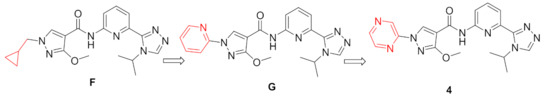 A number of modifications were done to improve the in vivo clearance, such as the macrocyclisation strategy which was employed in previous studies or reduction of the polar surface area (PSA). Results varied from improved potency but high in vivo clearance or high efflux ratio to loss of activity. The research group decided to increase the structural diversity of pyrazole compounds by adding different substituents on N’s pyrazole. The N-alkylated pyrazoles exhibited high potency (compound F, cell IC50 = 12 nM, Figure 14) yet all suffered from a high efflux rate. The N-pyridinyl derivatives showed a low efflux rate and acceptable potency (compound G’s IC50 = 299 nM, Figure 14). Continuous development and modification to the substituent attached to pyrazole led to the discovery of compound 4 (Figure 11 and Figure 14). It had a good balance of potency (cell IC50 = 138 nM) and an efflux rate of 5.0 [13].