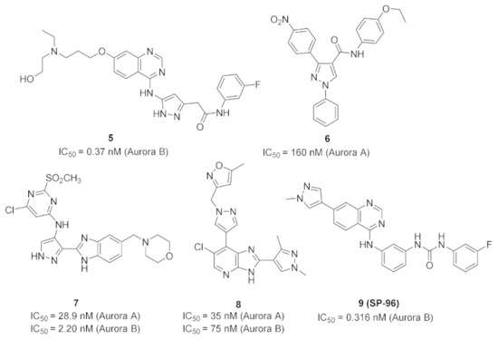 Aurora kinases are serine-threonine kinases that are involved in the mitosis process. Over-expression of Aurora kinases leads to cancer. Compound 5 (Barasertib, AZD1152) (Figure 15) is a highly selective Aurora B kinase inhibitor. Its IC50 value against Aurora B is 0.37 nM in a cell-free assay, which is over 3000-fold more selective toward Aurora B than Aurora A [14].