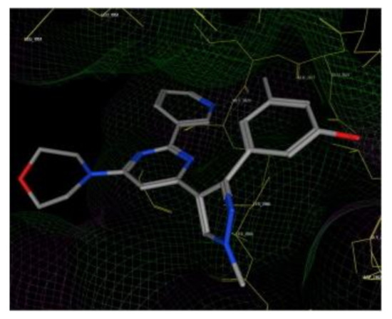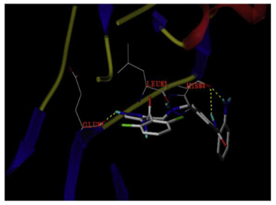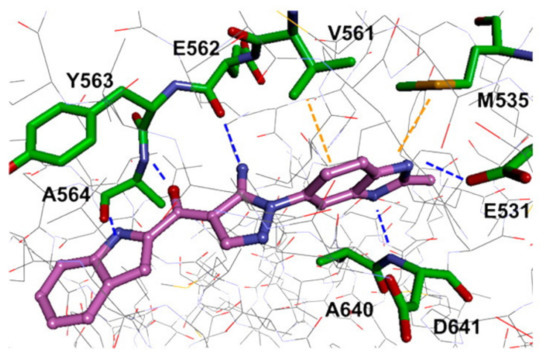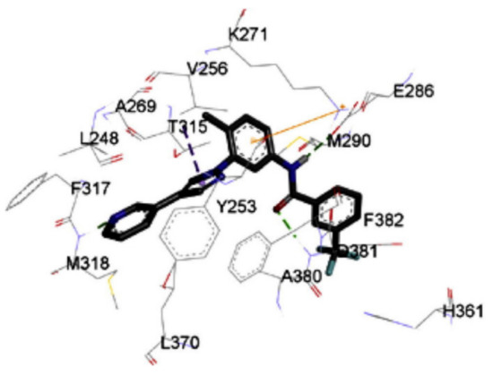 Docking study of compound 10 into the Bcr-Abl crystal structure was performed to study its binding mode. The pyridine ring is the hinge region-binding moiety of this structure, similar to imatinib. The pyridyl nitrogen accepts a hydrogen bond from Met318. The amide linker forms two more hydrogen bonds with Glu286 and Asp381. Moreover, the pyrazole ring forms pi-pi stacking interaction with Thr315 (Figure 20) [21].