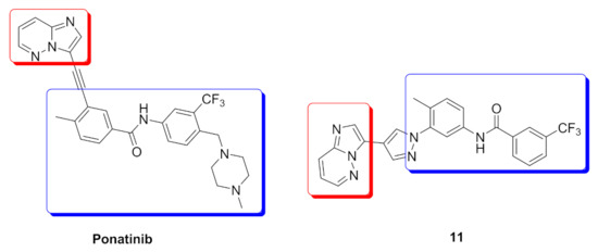 The same research group also reported compound 11 (Figure 18) possessing imidazo[1,2-b]pyridazine nucleus as a hinge region binder similar to ponatinib. Instead of the alkyne linker of ponatinib, compound 11 possesses a pyrazole ring similar to compound 10. The imidazo[1,2-b]pyridazine nucleus was found more favorable for activity against Bcr-Abl kinase than the pyridine ring of compound 10 (Figure 21) [22].