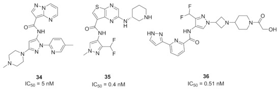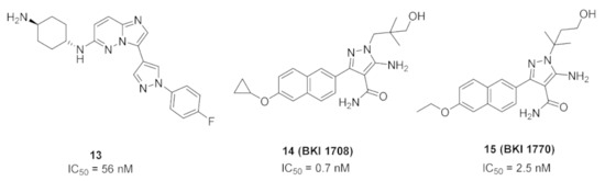 Compound 13 (Figure 24) has been reported as an inhibitor of Plasmodium falciparum calcium-dependent protein kinase 1 whose IC50 value equals 56 nM. This kinase is essential for a parasite’s life cycle stages of motility and to invade the red blood cells. Compound 13 showed anti-parasitic activity against Plasmodium falciparum with an IC50 value of 0.262 µM. The pyrazole ring is inserted in this structure instead of the 6-membered (hetero)aromatic rings to decrease logD and improve aqueous solubility and ADME profile. When incubated with human or mouse liver microsomal enzymes for 30 min, the remaining percentages of compound 13 were 80% and 84%, respectively. The SAR of this compound and its analogues revealed that fluoro is more optimal than cyano, and primary amino on the cyclohexyl ring is more favorable for activity than pyrrolidinyl or piperidinyl [27].
