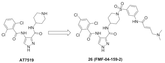 Akt kinase, which is also named protein kinase B, is a serine-threonine kinase that is involved in PI3K-Akt-mTOR signaling pathway. This pathway is important for cell survival, apoptosis, proliferation, and metabolism. There are three known isozymes of Akt: Akt1, 2, and 3. Akt inhibitors are potential anticancer agents. Compound 1 (Figure 2) is a conformationally restricted analogue of GSK2141795 (uprosertib) (Figure 3), a known pyrazole-based Akt inhibitor. This was done with the aim of optimizing biological activity, selectivity, and metabolic stability. The structure of AT-7867 (Figure 3), another old pyrazole-based Akt inhibitor, inspired that research group to hybridize both structures in order to obtain compound 1 and its analogues. Compound 1 was tested against a 23-kinase panel and it exerted selectivity towards the Akt family. Its IC50 value against Akt1 is 61 nM, while the IC50 value of GSK2141795 is 18 nM. Western blotting showed that compound 1 decreased the level of phosphorylation of GSK3β in PC-3 cells, a substrate of Akt. In addition, compound 1 reduced the level of p-PRAS40 in LNCaP cells with IC50 equal to 30.4 nM, which is more potent than GSK2141795 (IC50 = 75.63 nM). Compound 1 demonstrated antiproliferative activity against HCT116 and OVCAR-8 cell lines (IC50 = 7.76 and 9.76 µM, respectively). Dichlorophenyl moiety was the best option for the highest biological activity. Any other halogen substitution other than the dichloro led to lower potency [10].