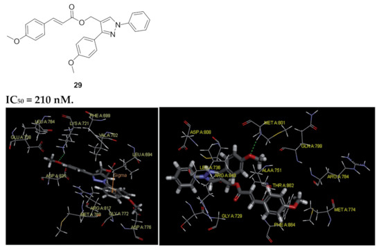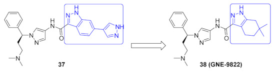Compound 4 (Figure 11) is a pyrazole derivative reported as ASK1 kinase inhibitor. ASK1 regulates both apoptosis and inflammation, and it has been involved in some diseases such as amyotrophic lateral sclerosis (ALS) and multiple sclerosis (MS). To study ASK1 modulation’s implication on neurodegenerative diseases, Xin et al., discussed the design and synthesis of ASK1 inhibitors based on a previous work that identified a macrocyclic compound (cell IC50 = 95 nM) obtained from the lead compound (IC50 = 607 nM, cell IC50 > 20 μM) (Figure 12). In this work, modifications on the distal phenyl ring were performed to improve potency of the lead towards ASK1. Docking of the lead into ASK1 revealed that the phenyl ring is placed in the solvent exposed area, and that explains the weak potency of the lead [13].