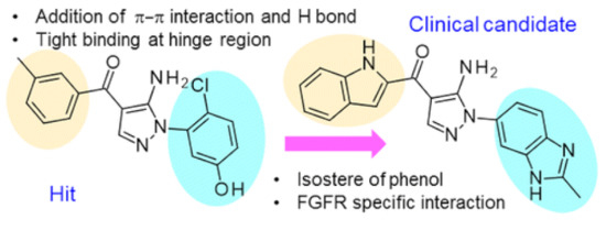 - Ebiike, H.; Taka, N.; Matsushita, M.; Ohmori, M.; Takami, K.; Hyohdoh, I.; Kohchi, M.; Hayase, T.; Nishii, H.; Morikami, K.; et al. Discovery of [5-Amino-1-(2-methyl-3H-benzimidazol-5-yl)pyrazol-4-yl]-(1H-indol-2-yl)methanone (CH5183284/Debio 1347), An Orally Available and Selective Fibroblast Growth Factor Receptor (FGFR) Inhibitor. J. Med. Chem. 2016, 59, 10586–10600. [Google Scholar] [CrossRef]