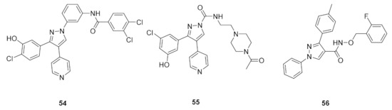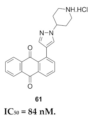 Checkpoint kinase 2 (Chk2) is involved in DNA damage response pathway. In addition, it is over-expressed by different types of cancer cells as it is essential for their survival. Chk2 inhibition is an avenue for cancer treatment. Galal et al., have reported a series of pyrazole-based Chk2 inhibitors. Compounds 16 and 17 (Figure 25) are examples of the most promising derivatives of that series. Their IC50 values against Chk2 in cell-free assay are 48.4 and 17.9 nM, respectively. In general, derivatives possessing amide moiety on the benzimidazole nucleus are more potent than carboxylic acid or nitro analogues. Furthermore, both compounds showed antiproliferative activity against HepG2 (hepatocellular carcinoma), HeLa (cervical), and MCF7 (breast) cancer cell lines but compound 17 is more potent (IC50 = 10.8, 11.8, and 10.4 µM, respectively). Both compounds induced cell cycle arrest in MCF7 cells, and both of them exerted synergistic cytotoxicity in vitro and in vivo, in combination with doxorubicin or cisplatin [29].
