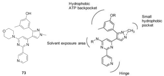 Compound 12 (Asciminib, ABL-001) (Figure 18) is a non-ATP competitive inhibitor of Bcr-Abl kinase with a Kd value of 0.5–0.8 nM and an IC50 value of 0.5 nM. It is able to inhibit the T315I mutant Bcr-Abl as well (IC50 = 25 nM) [23,24]. Asciminib is a clinical candidate currently under clinical trials in patients with CML, alone or in combination with imatinib [25].