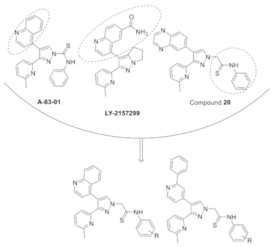 - Zhao, L.-M.; Guo, Z.; Xue, Y.-J.; Min, J.Z.; Zhu, W.-J.; Li, X.-Y.; Piao, H.-R.; Jin, C.H. Synthesis and Evaluation of 3-Substituted-4-(quinoxalin-6-yl) Pyrazoles as TGF-β Type I Receptor Kinase Inhibitors. Molecules 2018, 23, 3369. [Google Scholar] [CrossRef]