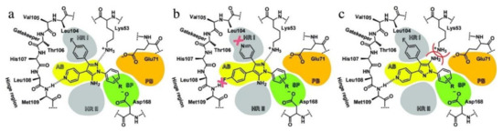 - Röhm, S.; Schröder, M.; Dwyer, J.E.; Widdowson, C.S.; Chaikuad, A.; Berger, B.-T.; Joerger, A.C.; Krämer, A.; Harbig, J.; Dauch, D.; et al. Selective targeting of the αC and DFG-out pocket in p38 MAPK. Eur. J. Med. Chem. 2020, 208, 112721. [Google Scholar] [CrossRef] [PubMed]