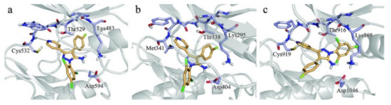 - Tucker, J.A.; Klein, T.; Breed, J.; Breeze, A.L.; Overman, R.; Phillips, C.; Norman, R.A. Structural Insights into FGFR Kinase Isoform Selectivity: Diverse Binding Modes of AZD4547 and Ponatinib in Complex with FGFR1 and FGFR4. Structure 2014, 22, 1764–1774. [Google Scholar] [CrossRef]