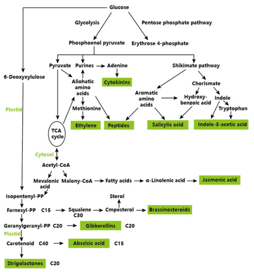In general, the higher plant hormone biosynthesis pathway has been relatively detailed. Auxin, cytokinin, ethylene, and salicylic acid are mainly produced by glucose through glycolysis, as shown in Figure 1. After glycolysis, adenine can be produced and directly produce cytokinin, while ethylene comes primarily from methionine. Indole-3-acetic acid comes from tryptophan, and indole-3-acetic acid can also be directly synthesized through precursor indole. C-40 carotenoids in the plastid can be oxidized to produce different fragments, which will be further metabolized into active hormones, mainly abscisic acid and strigolactone (Figure 1).