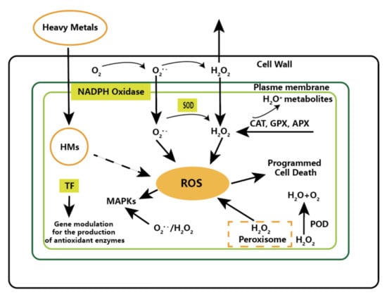 Graphical representation of reactive oxygen species (ROS) in heavy metal signal transduction. Adapted with the permission from Elsevier (2016) [99].