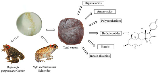 Toad venom (Bufonis Venenum, known as ‘Chansu’ in Chinese), the dry secretion of Bufo bufo gargarizans Cantor and Bufo melanostictus Schneider, is recorded in the 2020 edition of the Chinese Pharmacopoeia and has efficacy in providing detoxification, pain relief, resuscitation and refreshment. It can be used in the treatment of carbuncles, gangrene, sore throats, sunstroke, abdominal pain, vomiting and diarrhea [1]. The chemical composition of toad venom includes bufadienolides, indole alkaloids, sterols, polysaccharides, amino acids and organic acids, among which bufadienolides and indole alkaloids are considered to be the main active ingredients [2]. Bufo bufo gargarizans Cantor and Bufo melanostictus Schneider squeeze out a white slurry from their posterior auricular glands and skin glands, which is processed and dried to obtain toad venom. After the toad venom is extracted, the toad can recover in three to four weeks (Figure 1). Bufadienolides are the main chemical components of toad venom, whose structures are steroids connected with a α-pyrone ring at position C-17 [3]. Studies have shown that toad venom contains 96 kinds of bufadienolides monomers [4], among which gamabufotalin (CS-6), arenobufagin (ABG), 1β-hydroxyl-arenobufagin (1β-OH-ABF), telocinobufagin (TBG), bufalin (BF), hellebrigenin (HBG), ψ-bufarenogin and 19-hydroxybufalin (19-HB), bufotalin (BL), cinobufotalin (CBL), cinobufagin (CBG), resibufogenin (RBG) and marinobufagin (MBG) are considered the major effective anticancer agents (Figure 2), and these ingredients have high activity and high toxicity profiles [5,6,7]. Additionally, bufadienolides have many other pharmacological activities in vivo and in vitro, such as cardiovascular, analgesic and anti-inflammatory effects, and so on. The content of CS-6, TBG, BL, CBL, BF, CBG and RBG accounts for more than 85% of the total bufadienolides. BF, CBG and RBG account for a large proportion of bufadienolides compounds, and the total content of the three compounds is 5–10% [8]. Cao et al. [9] found that there was a correlation between CBG, BF and TBG and the total content of bufadienolides. Compared with the existing matrix control indices of CBG and RBG, these three components better reflect the overall content of bufadienolides. This discovery is helpful in the revision of the quality standard of toad venom.