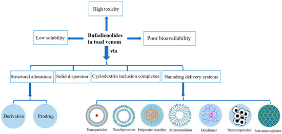 Structural modification and pharmaceutical formulation strategies are the methods to improve the solubility and bioavailability of bufadienolides. Structural modification includes the preparation of derivatives and prerequisite drugs, and pharmaceutical formulation strategies include solid dispersions, cyclodextrin inclusion complexes and nanodrug delivery systems, and so on (Figure 4).