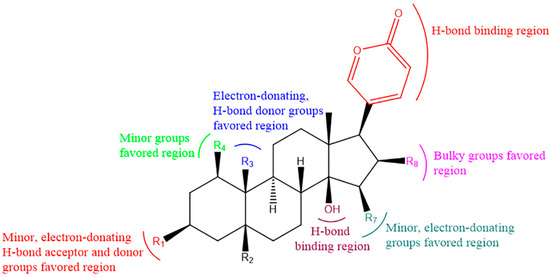 Structural modification can change the performance of drugs and is one of the effective ways to develop new drugs. Structural modification has succeeded in expanding the antimicrobial spectrum, enhancing antimicrobial activity, overcoming drug resistance, improving pharmacokinetic properties, reducing toxic side effects and adapting to formulation needs [75,76,77]. The structure–activity relationship of bufadienolides revealed by 3D-QSAR study is shown in Figure 5, which provides reliable information for structure modification and rational drug design of bufadienolides with anticancer activities in medical chemistry [78].