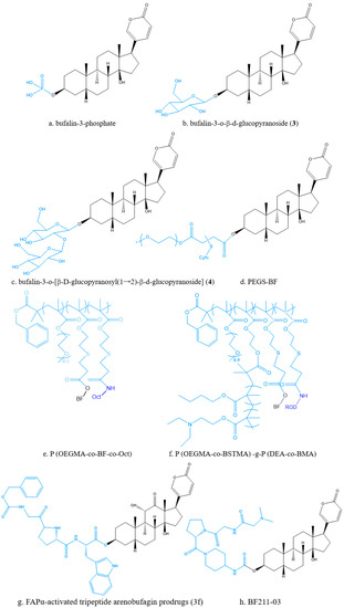 Structural modifications also employ biosynthesis by adding precursors. Prodrugs are common methods for chemical structure modification of nervous system drugs, antitumor system drugs and antiviral drugs, which can increase the solubility and bioavailability of drugs, enhance targeting, and reduce the toxicity and side effects of drugs. Bufalin 3-phosphate (Figure 7a) is a water-soluble prodrug that could solve the problem of water solubility of BF and facilitate its administration in vivo. Furthermore, bufalin 3-phosphate was also demonstrated to effectively inhibit tumor growth in an orthotopic triple negative breast cancer (TNBC) mouse model [84]. Liu et al. [85] obtained bufalin-3-O-β-d-glucopyranoside (3) (Figure 7b) and bufalin-3-O-[β-d-glucopyranosyl (12)-β-d-glucopyranoside)] (4) (Figure 7c) by using an efficient chemical enzymatic method to glycosylate bufalin. The water solubility of compounds (3) and (4) was 13.1 and 53.7 times that of BF, respectively. PEGS-BF (Figure 7d) was a novel polyethylene glycol (PEG)-based polymeric prodrug of BF, which could improve its water solubility and stability on the premise of maintaining its original anticancer activity. The results showed that the solubility of PEGS-BF was about 17.3 mg/mL, which was about 21 times higher than that of free BF (32.76 μg/mL) [86].