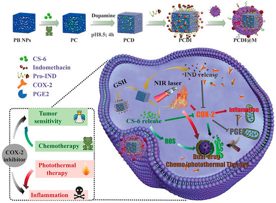- Xiao, C.; Tong, C.; Fan, J.; Wang, Z.; Xie, Q.; Long, Y.; You, P.; Wang, W.; Liu, B. Biomimetic nanoparticles loading with gamabutolin-indomethacin for chemo/photothermal therapy of cervical cancer and anti-inflammation. J. Control Release 2021, 339, 259–273. [Google Scholar] [CrossRef]