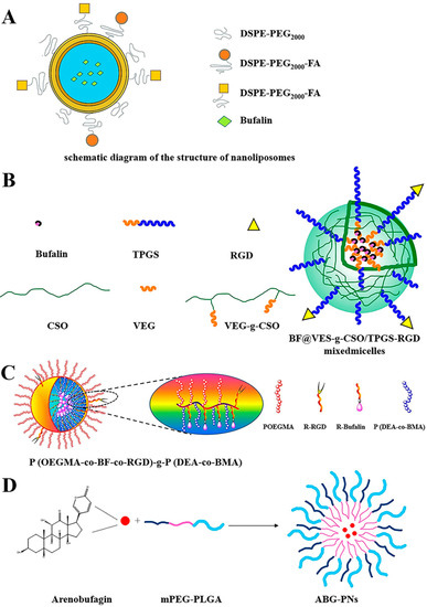 - Xu, Y.; Tang, L.; Chen, P.; Chen, M.; Zheng, M.; Shi, F.; Wang, Y. Tumor-Targeted Delivery of Bufalin-Loaded Modified Albumin-Polymer Hybrid for Enhanced Antitumor Therapy and Attenuated Hemolysis Toxicity and Cardiotoxicity. AAPS PharmSciTech 2021, 22, 137. [Google Scholar] [CrossRef]