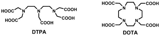 The two standard ligand scaffolds used in clinically approved GBCAs. (DTPA = diethylenetriaminepentaacetic acid or pentetic acid; DOTA = 1,4,7,10-tetraazacyclododecane-1,4,7,10-tetraacetic acid or tetraxetan).