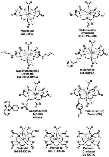 All clinically approved GBCAs are neutral or negatively charged with nearly identical biodistribution. GBCAs are generally extracellular fluid agents and rapidly equilibrate in the extracellular space. The pharmacokinetic parameters (clearance rate, distribution and elimination half-life and steady state distribution volume) that characterize the distribution and elimination of the agent can be determined by fitting the plasma concentration vs. time data to the standard two-compartment open model. As expected, based on their highly hydrophilic nature, GBCAs are eliminated by renal filtration with a half-life of approximately 90 min in healthy individuals [2,3,4,5,6,7,8,9,10]. It is worth noting that agents with hydrophobic aromatic substituents (benzyloxymethyl or p-ethoxybenzyl) on the ligand framework are also partly cleared by hepatobiliary excretion, and consequently, these complexes are used as liver specific agents (Eovist, Multihance (Europe)).