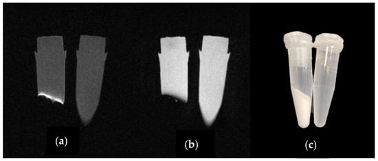At 1 Tesla, GdPO4 phantom shows enhancement at the solution solid interface. (a) T1-weighted spin echo image (TR/TE = 350/13.1 ms), (b) T2-weighted spin echo image (TR/TE = 1600/120 ms), (c) A photo of the microcentrifuge tubes making up GdPO4 phantom: the tube on the right contains deionized (DI) water, the one on the left contains a GdPO4 precipitate in DI water after centrifugation.