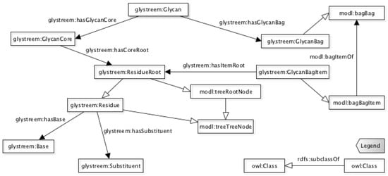 To represent the tree nature of the glycan structure and to ensure an efficient navigation, we relied on a recently described ontology modeling a tree logical structure []. This ontology provides the logical wrappers to capture the key elements of a tree. For example, the TreeNode and the RootNode classes are used to wrap—as super-classes—respectively, the Residue and the ResidueRoot classes. To represent the group of undefined residues, the bag logical model that belongs to the same library was chosen. Therefore, the GlycanBag class has been declared as a subclass of Bag, and the GlycanBagItem class as a subclass of the BagItem class, inheriting all the axioms and properties related to their logical ancestors.