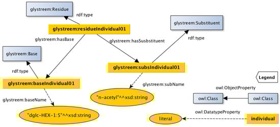 The defined structure of the glycan can then be extended with building blocks populating the glycan. The building blocks are decomposed, following the GlycoCT syntax, into bases and substituents, which are represented, respectively, through the Base and Substituent classes. The Residue class is linked to these classes through the hasBase and hasSubstituent relationships. The Base and Substituent classes collect the building block information on: