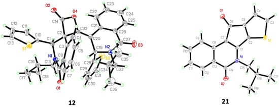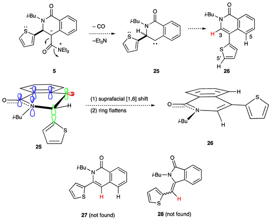 A second high-Rf product, which co-chromatographs with ketone 21 in many eluants, was identified in the mixture as the decarboxylated isoquinolin-1-one, 26 (Scheme 4), and then was partially purified. The structure is assigned to 26 based on its mass, H-1 and C-13 spectra, and by comparison to reference compounds in the literature. In particular, the new ring methine H-3 (in red) is shifted downfield (7.17 ppm; compare 7.20 ppm reported for the closely related N-methyl analogue [20]) relative to a possible isomeric structure with thienyl at C-3 (27). The latter compound (H-4, in red, expected at 6.6 ppm [21]), which would have resulted from a C-3 to C-4 hydride shift, was not detected in the reaction of 2. Likewise, a ring-contracted indolinone 28 can be ruled out (and was not detected as a product) based on the absence of the 1 H (in red) singlet expected at 6.7–6.8 ppm [22,23]. The 2′ attachment of the thienyl ring is retained in 26, as confirmed by the thienyl coupling pattern (e.g., H-5′, dd, J = 4.8, 1.6 Hz).