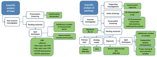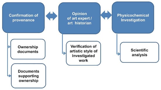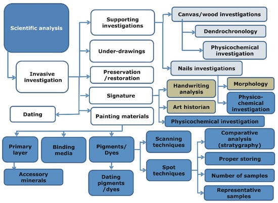 The scientific analysis (i.e., the last step in Figure 1) consists of a wide range of various noninvasive and invasive analytical methods. In our opinion, the authentication process can benefit from purpose-oriented organization and implementation of these methods. A scheme presented in Figure 2 summarizes the proposed general approach applied in such tasks. The individual steps refer to the types of investigations and to the particular materials that should the analyzed but not directly to specific analytical techniques. The proposed scheme should also cover the procedures of collecting, storing and protecting samples, as well as general analysis methods. Moreover, the scheme should be repeatable and applicable to various objects. It includes various possibilities that should be considered during investigations. However, new investigative paths can be suggested with the growing amount of studies.