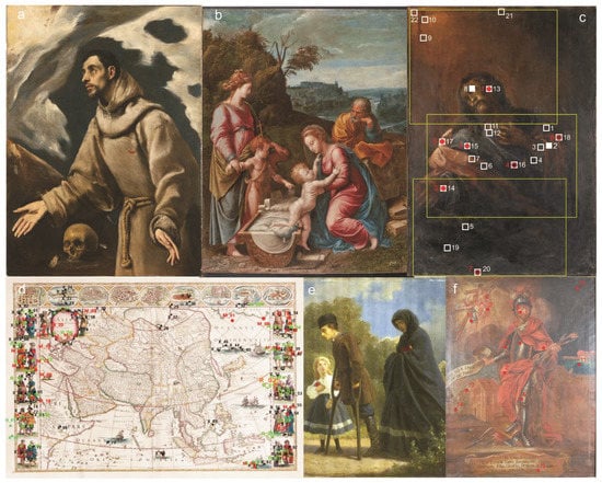 Example of investigated pieces of art: (a) El Greco “Ecstasy of Saint Francis” ca 1575–1580, the Diocese Museum in Siedlce (Poland). (b) G. Penni “The Holy Family with Saint John and Saint Catherine”, National Museum in Warsaw (Poland). (c) M.L. Willmann “Christ in Gethsemane”, Church of the Assumption of the Blessed Virgin Mary in Żagań (Poland). (d) Willem & Joan Blaeu, Theatrum orbis terrarum sive Atlas Novus, Amsterdam 1649–1655, Ossoliński National Institute in Wrocław (Poland). (e) A. Grotter “After the uprising” 1864, National Museum in Wrocław (Poland), (f) J.J Knechtl “Bolko II Świdnicki” ca. 1720, Krzeszów (Poland).